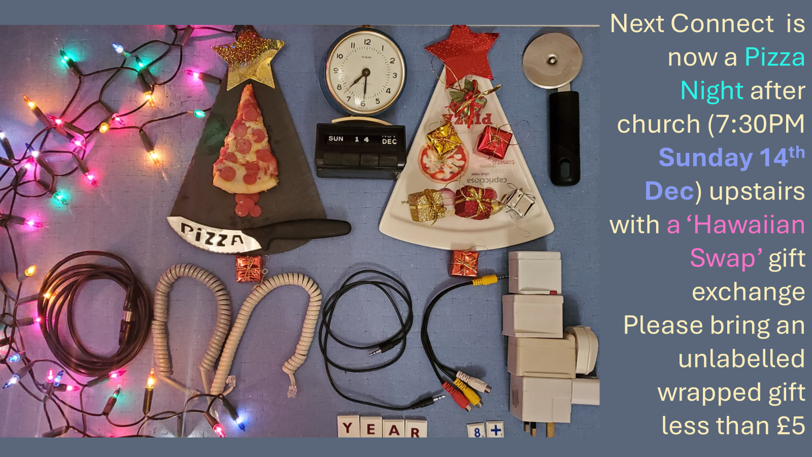 Due to encouragng numbers attendng this year, in a change to come listings, Connect on Sunday 14th will be a pizza night after church at 7:30PM (rather than carol singing).